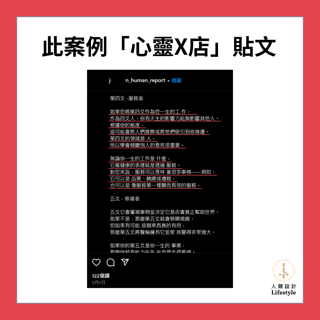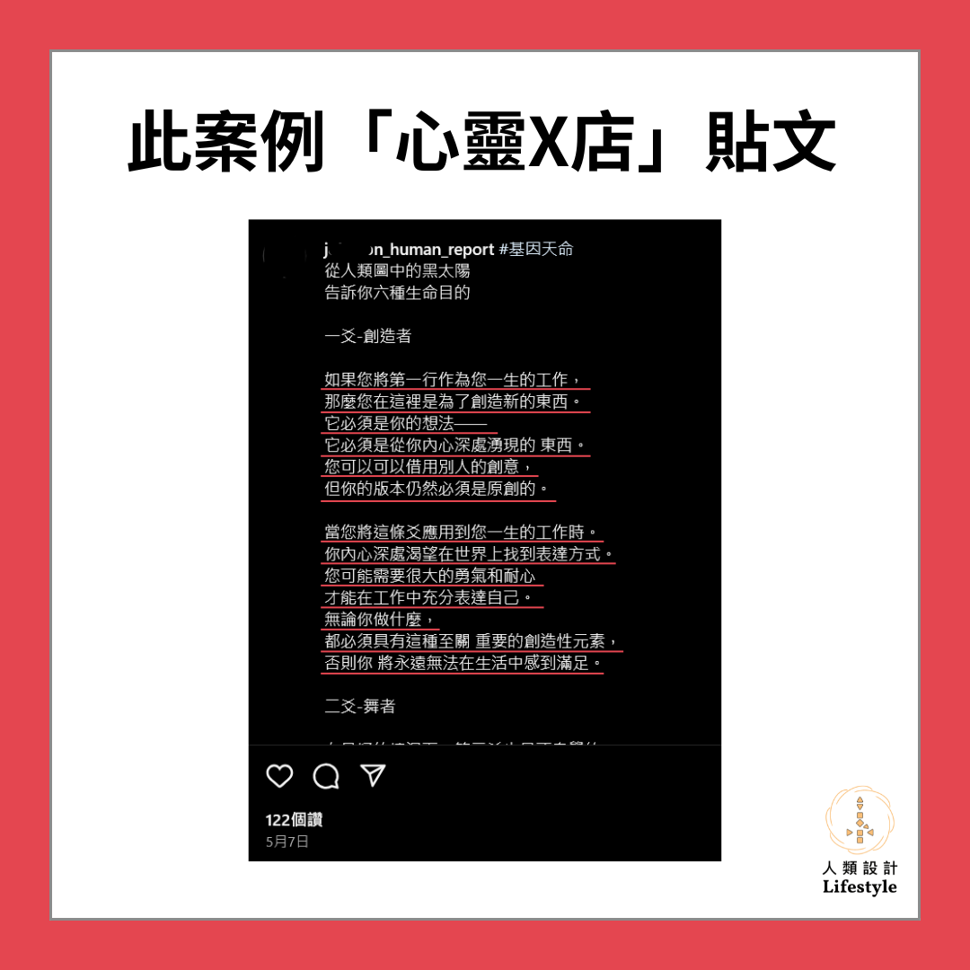 然而很可惜的是,這次的案例「心靈X店 JXXXXXn_human_report」,很顯然並沒有做到這件事情。而他的貼文相當碎片化、毫無基因天命的脈絡,並使用 google 翻譯的內容直接張貼在社群平台上,也可以凸顯出他對基因天命這門知識的理解程度有多少。