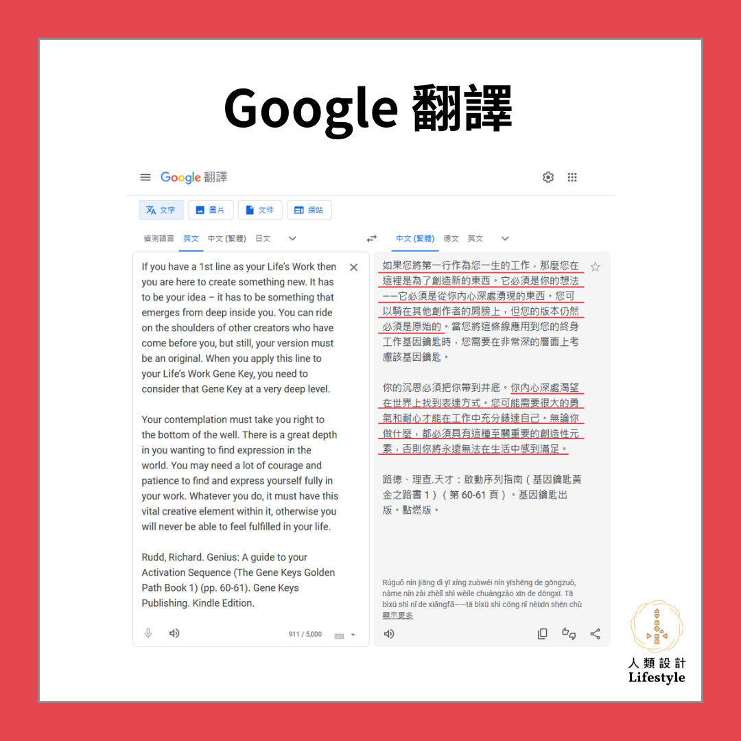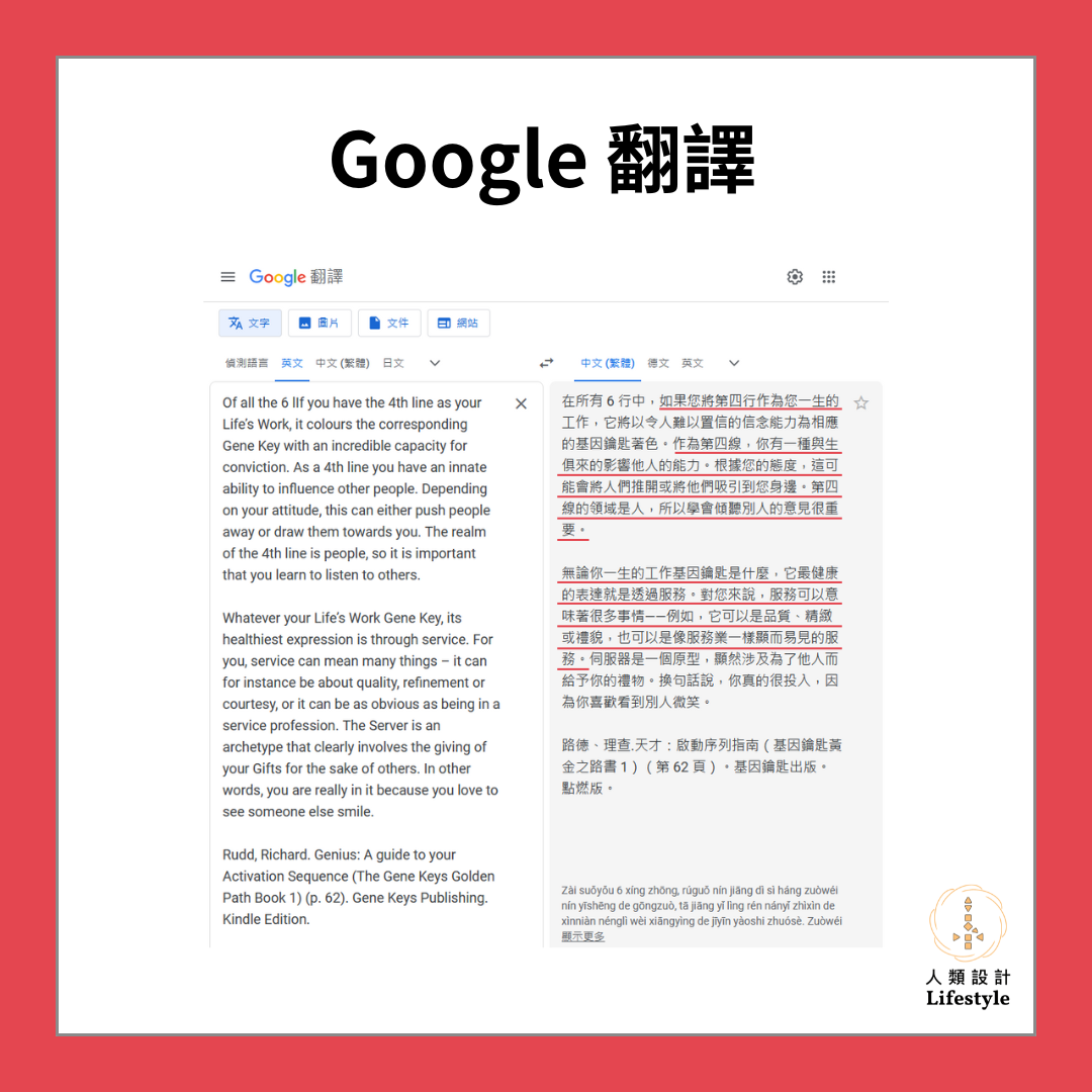 這個案例「心靈X店 JXXXXXn_human_report」,在 2024 年五月七日發表基因天命文章。我在閱讀過程中就發覺他的文字有許多破碎和前後不連貫的地方,很不像正常人寫出來的文字。好奇之下開了基因天命的原文書對照,並使用 google 翻譯將原文的內容翻譯成中文。